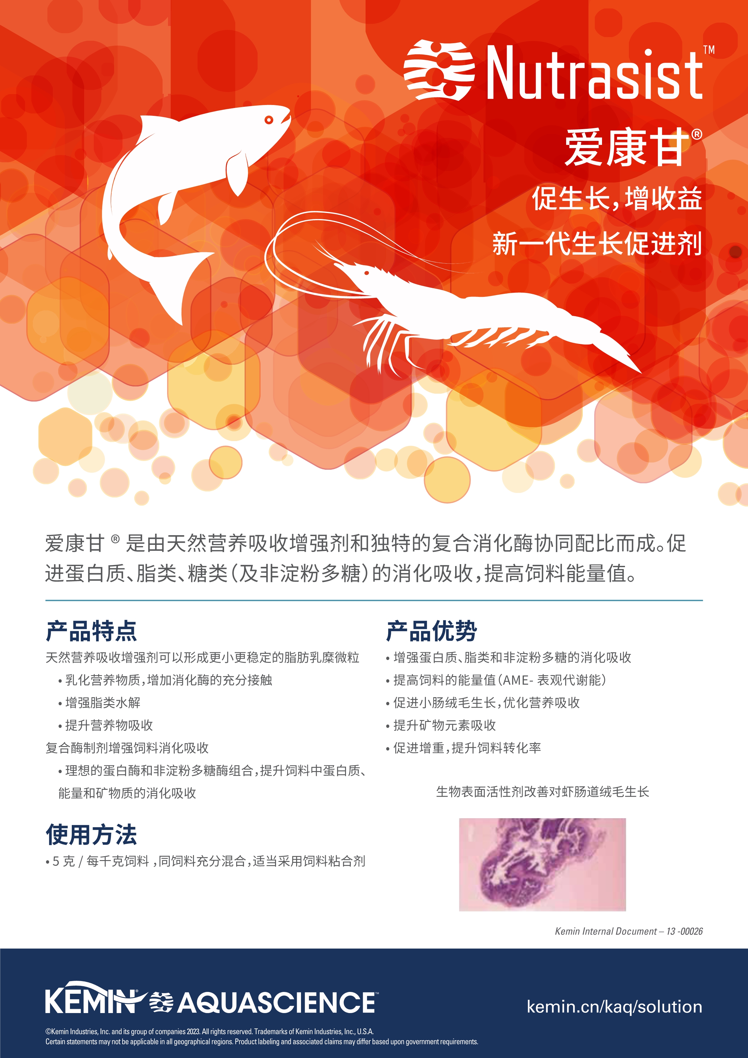爱康甘®是由天然营养吸收增强剂和独特的复合消化酶协同配比而成。促进蛋白质、脂类、糖类(及非淀粉多糖)的消化吸收,提高饲料能量值。