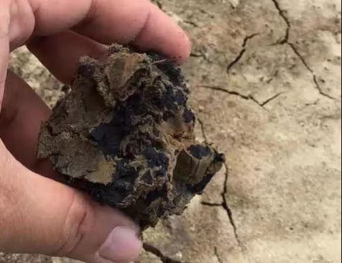 由于存在有机废弃物,池塘土壤表层干燥,下层土壤仍保持黑色。