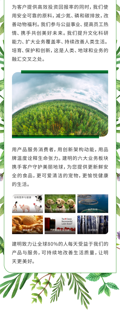 在动物营养与健康、水产科技、人类营养与健康、食品技术、宠物营养与健康、纺织助剂等领域,建明正努力让你的畜牧养殖更安全,让你的身体充满活力,让你的食品更新鲜,让你的宠物更快乐,让你的衣着更环保。