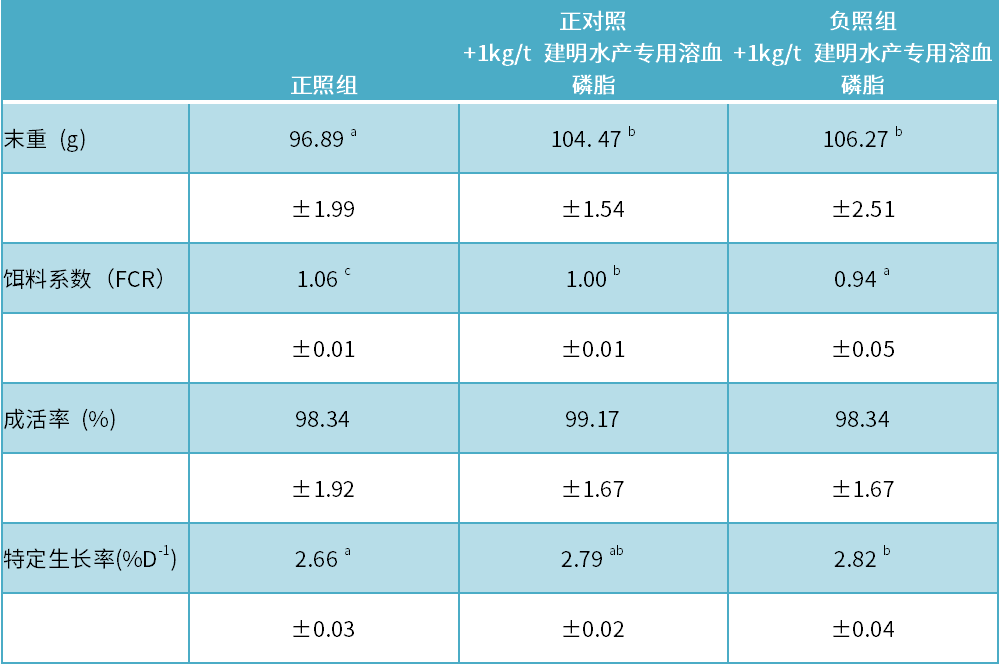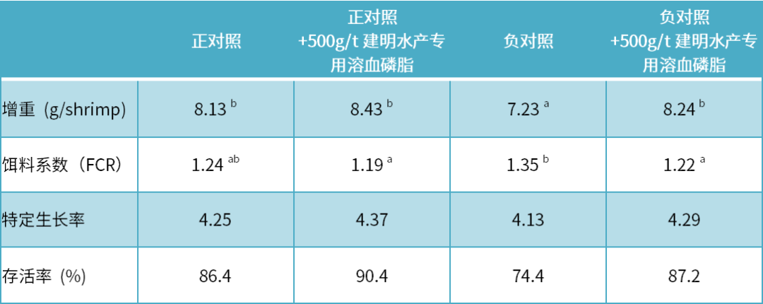 本实验以对虾为实验对象,评估在日粮中减少1%鱼油的前提下,建明水产专用溶血磷脂对其生长性能的影响。结果如表2,和正对照相比较增重改善3.7%,FCR改善4%。详细数据请参阅以下推文: