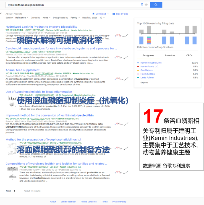 建明是行业中研究溶血磷脂的先驱,在全球范围内有超过200个关于溶血磷脂的动物实验报告,涵盖了对虾、鱼类、肉鸡、蛋鸡和猪等。在专利检索中可以看到,建明拥有数十条关于溶血磷脂的专利(图3),主要集中于工艺技术、动物营养和动物健康等主题,每一条专利都是建明研发中心夜以继日深耕产品的佐证,也是产品优良性能的最强背书。