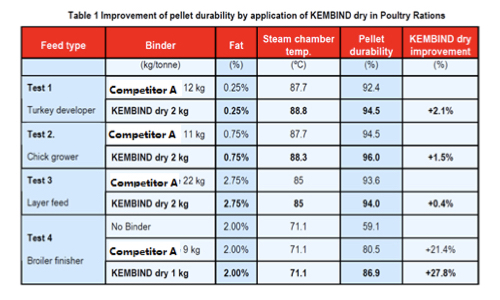 表2 凯多邦™对饲料含粉率%的影响 显示添加凯多邦TM后显著降低了饲料的含粉率